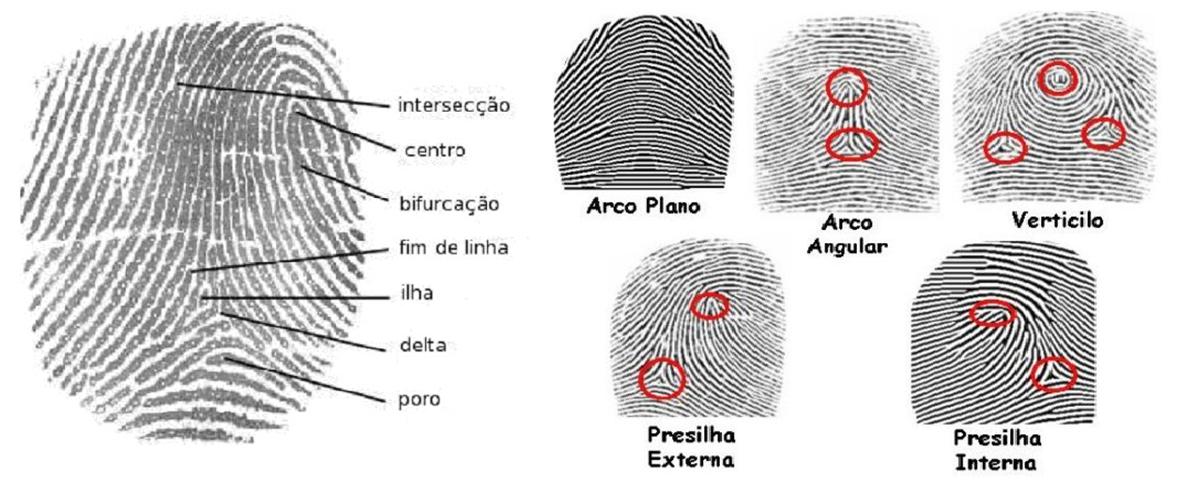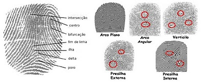 Uma coisa é verdade! Na análise das impressões digitais a comparação é efectuada a partir de 6-7 pontos-chave escolhidos de entre os traços mais característicos, mostrados na figura seguinte. Se todos coincidirem temos a chamada: “Correspondência Positiva”. O prezado leitor pode também tentar descobrir qual é o seu tipo de impressão digital.